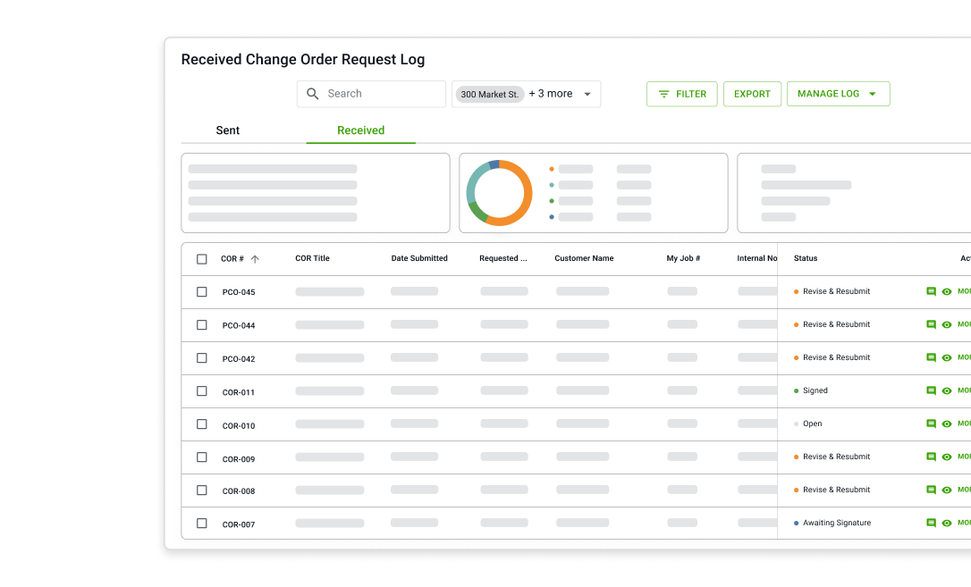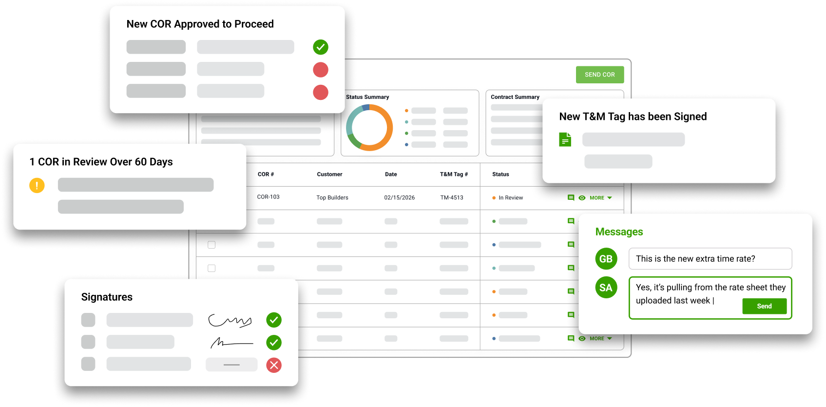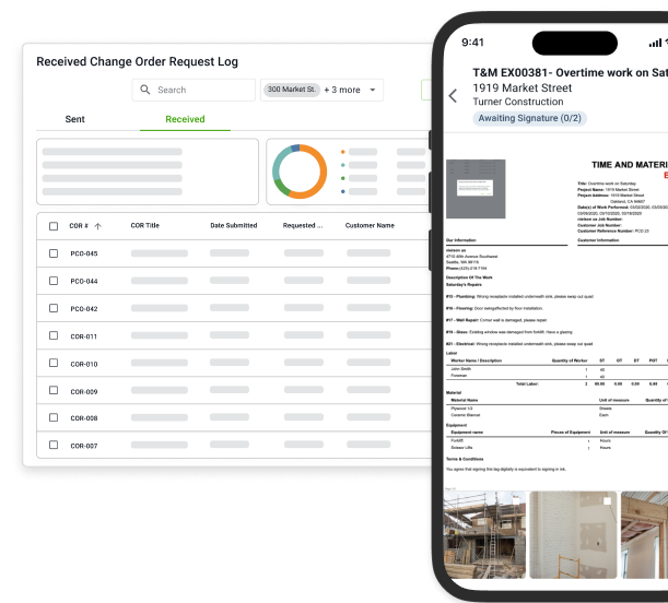 Instantly capture T&M work with photos and signatures, generate clean CORs, automatically generate a live Change Order Log, and share with stakeholders in real time.