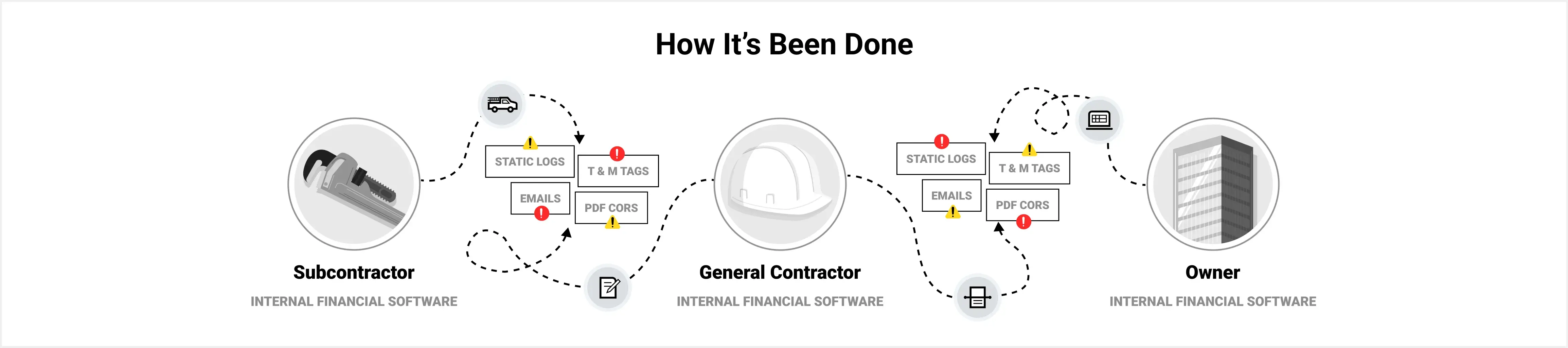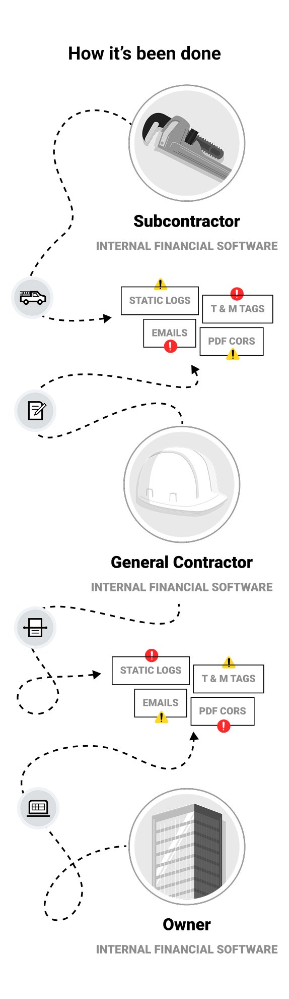 Collaborate with project stakeholders in real-time, regardless of what financial software you use internally. We help project teams stay on the same page with automated workflows to eliminate static COR logs, carbon copy T&M Tags, and the drudgery of sifting through emails to understand the latest cost impacts.